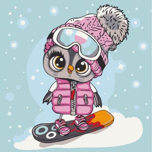 Опис Картина по номерам "Совеня на сноуборді" 30х30 см