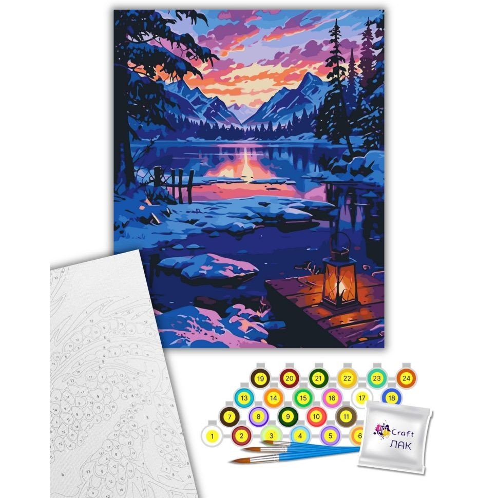 Комплектація: полотно на підрамнику з галерейною натяжкою, паперовий дублікат з контурним малюнком картини (на картині нанесена схема контурів зображення з нумерацією), художні нейлонові пензлі, палітра акрилових фарб у контейнерах
