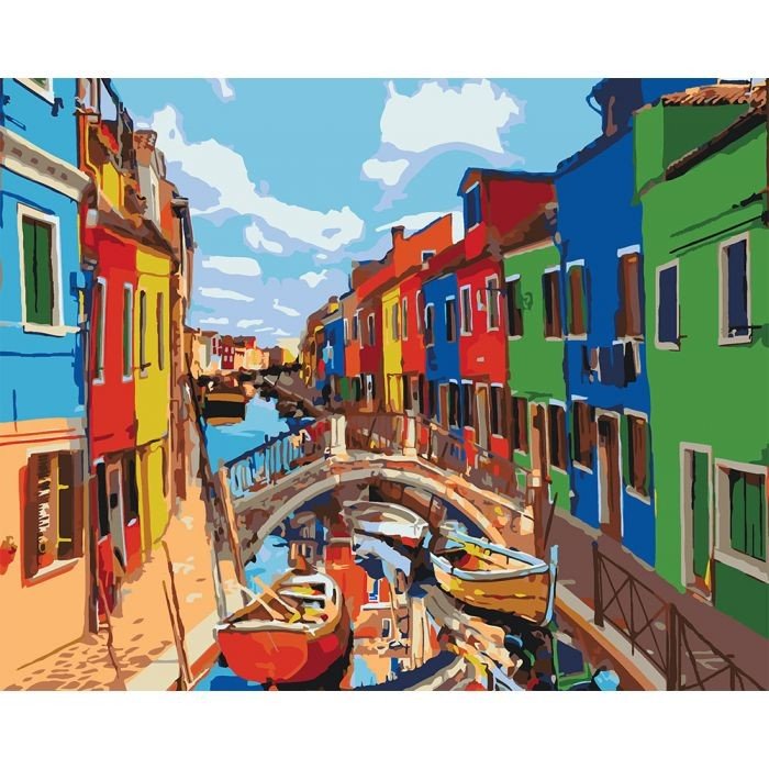 Картина за номерами "Фарби міста". Для того, щоб намалювати картину, необхідно малювати по пронумерованим контурам, які відповідають кольору фарби. У наборі: натуральне полотно на підрамнику з галерейного натяжкою, паперова дублікат з контурним малюнком картини (на картині нанесена схема контурів зображення з нумерацією), 3 нейлонові художні кисті, палітра акрилових фарб в контейнерах. Всі необхідні фарби вже в комплекті і не вимагають змішування. Розмір: 40 х 50 см. Кількість кольорів: 24. Складність - ★★★.