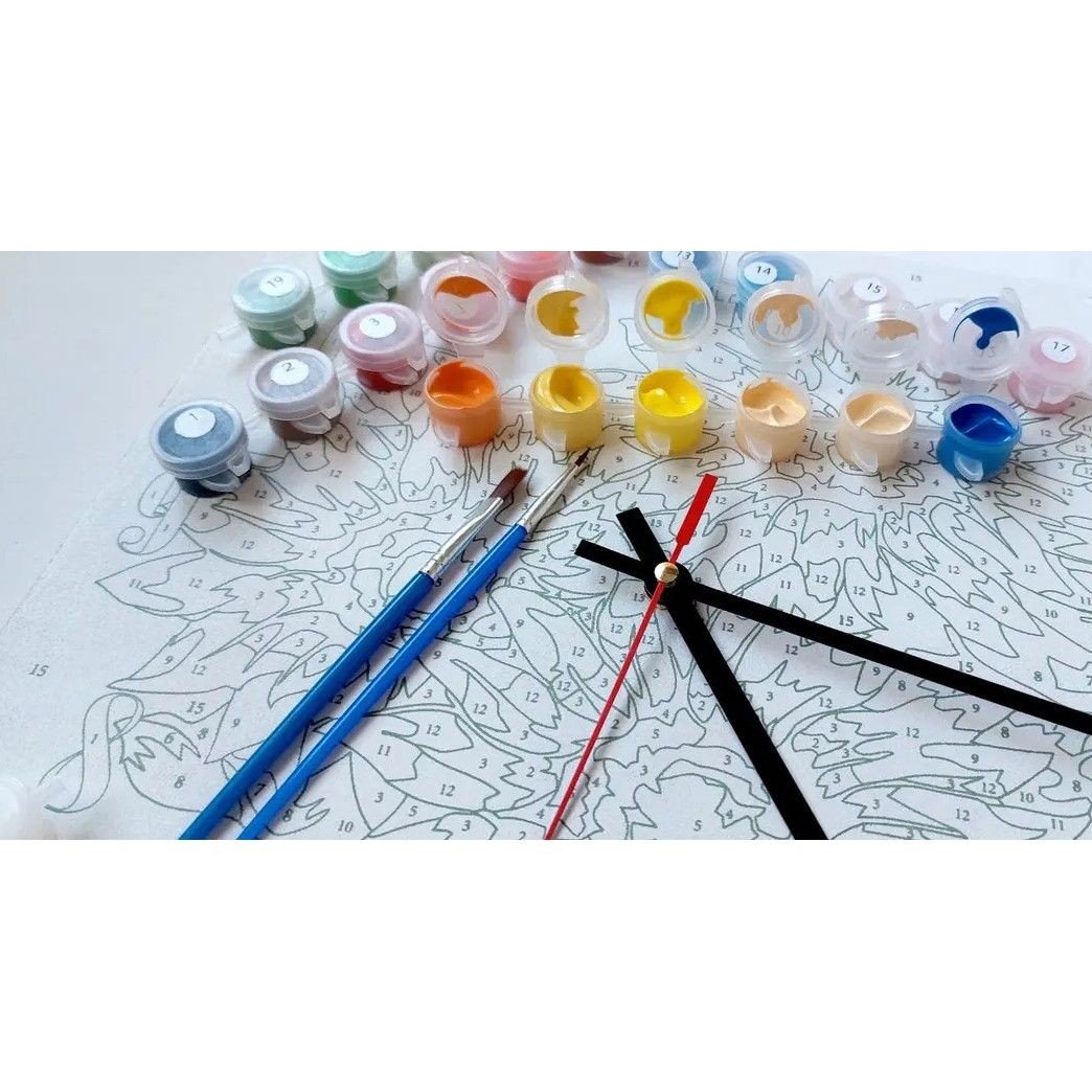 За допомогою даного набору можна розфарбовувати не просто картину, а справжній годинник. Подібний виріб стане чудовим подарунком або доповненням інтерʼєру. Для того, щоб намалювати картину, необхідно малювати за пронумерованими контурами, які відповідають кольору фарби. У наборі: годинниковий механізм зі стрілками, ДВП на широкому підрамнику (2,5 см.), паперова дублікат з контурним малюнком картини (на картині нанесена схема контурів зображення з нумерацією), нейлонові художні пензлі, палітра акрилових фарб у контейнерах та зручне кріплення. Усі необхідні фарби вже в комплекті та не потребують змішування. Розмір: 30х30 см.