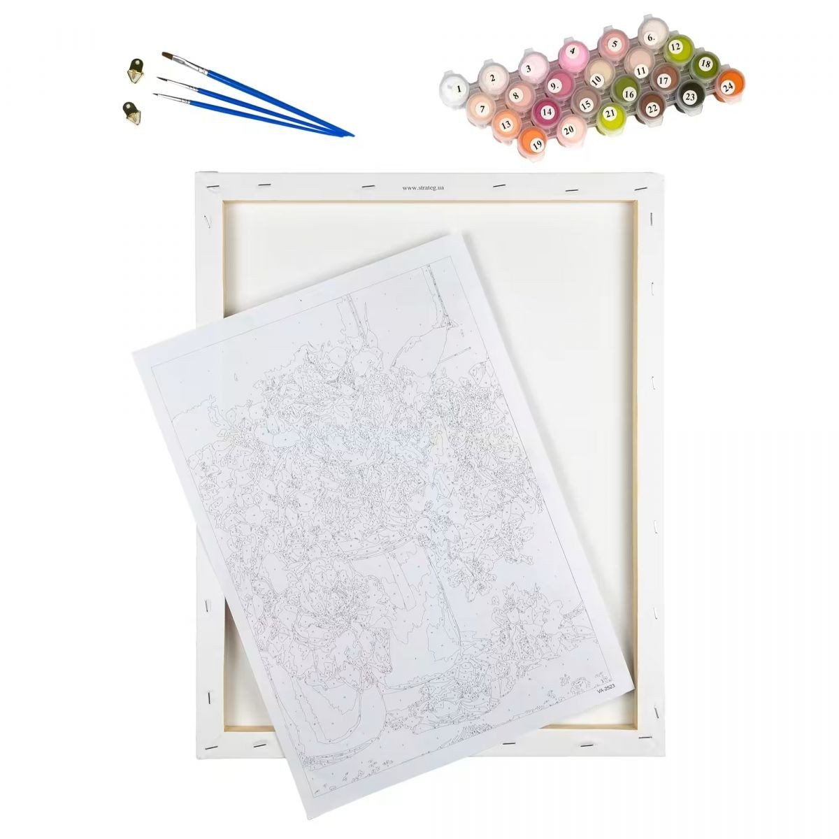 Бренд: Strateg Упаковка: Плівка Колір: Різнобарв'я Габарити в упаковці: 20 x 20 x 2 см Габарити без упаковки: 20 x 20 x 2 см Країна виробник: Україна Матеріал: Комбінований Комплектація: Полотно на підрамнику з галерейною натяжкою, паперова інструкція з контурним малюнком картини, нейлонові пензлі, палітра акрилових фарб у контейнерах