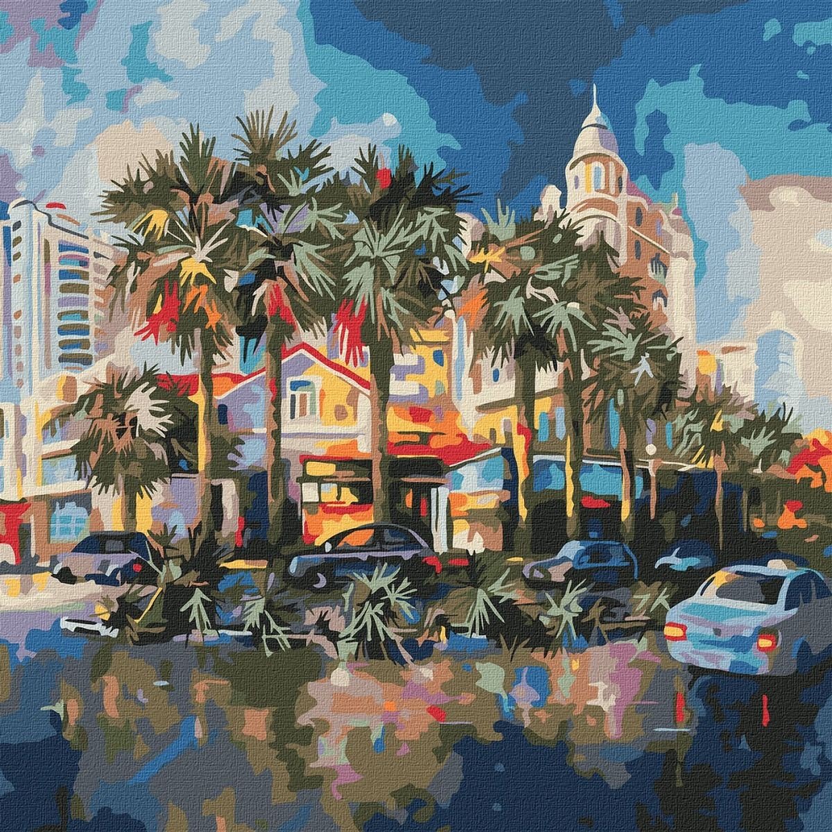 Картина за номерами. Для того, щоб намалювати картину, необхідно малювати за пронумерованими контурами, які відповідають кольору фарби. У наборі: натуральне полотно на підрамнику з галерейною натяжкою, паперова дублікат з контурним малюнком картини (на картині нанесена схема контурів зображення з нумерацією), художні нейлонові пензлі, палітра акрилових фарб у контейнерах. Усі необхідні фарби вже в комплекті та не вимагають змішування. Розмір: 50 х 50 см. Складність – ★★★.