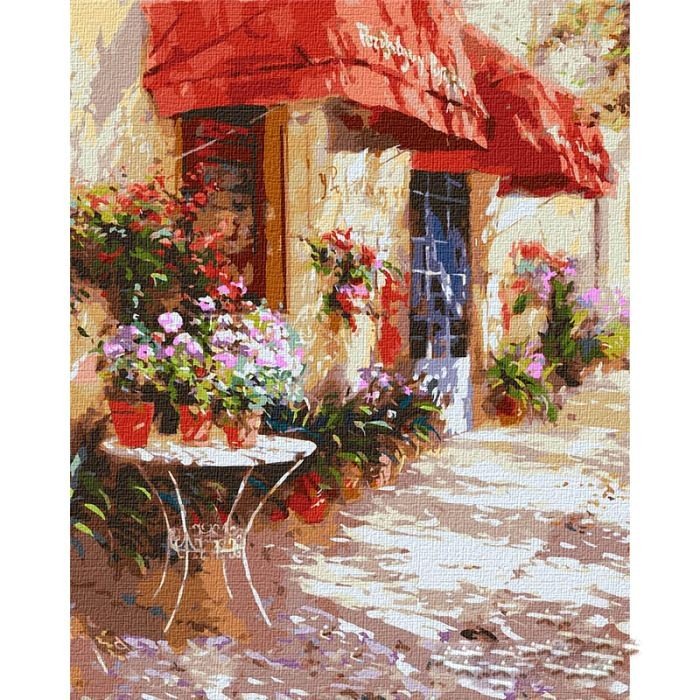 Картина за номерами "Квітковий магазин". Для того, щоб намалювати картину, необхідно малювати по пронумерованим контурам, які відповідають кольору фарби. У наборі: натуральне полотно на підрамнику з галерейного натяжкою, паперова дублікат з контурним малюнком картини (на картині нанесена схема контурів зображення з нумерацією), 3 нейлонові художні кисті, палітра акрилових фарб в контейнерах. Всі необхідні фарби вже в комплекті і не вимагають змішування. Розмір: 40 х 50 см. Кількість кольорів: 38. Складність - ★★★★★.