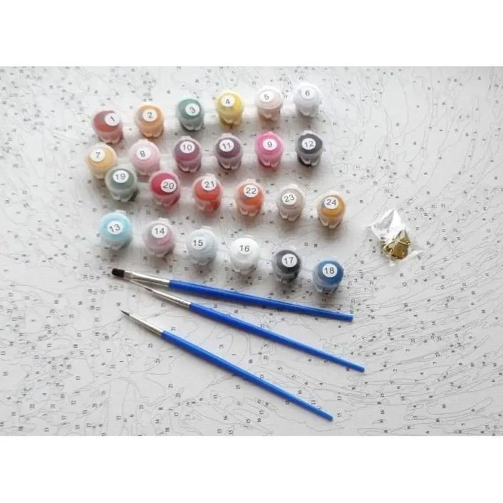 Картина за номерами. Для того, щоб намалювати картину, необхідно малювати за пронумерованими контурами, які відповідають кольору фарби. У наборі: полотно на підрамнику з галерейною натяжкою, паперовий дублікат з контурним малюнком картини (на картині нанесена схема контурів зображення з нумерацією), художні нейлонові пензлі, палітра акрилових фарб у контейнерах. Усі необхідні фарби вже в комплекті та не вимагають змішування. Розмір: 40х50 см.