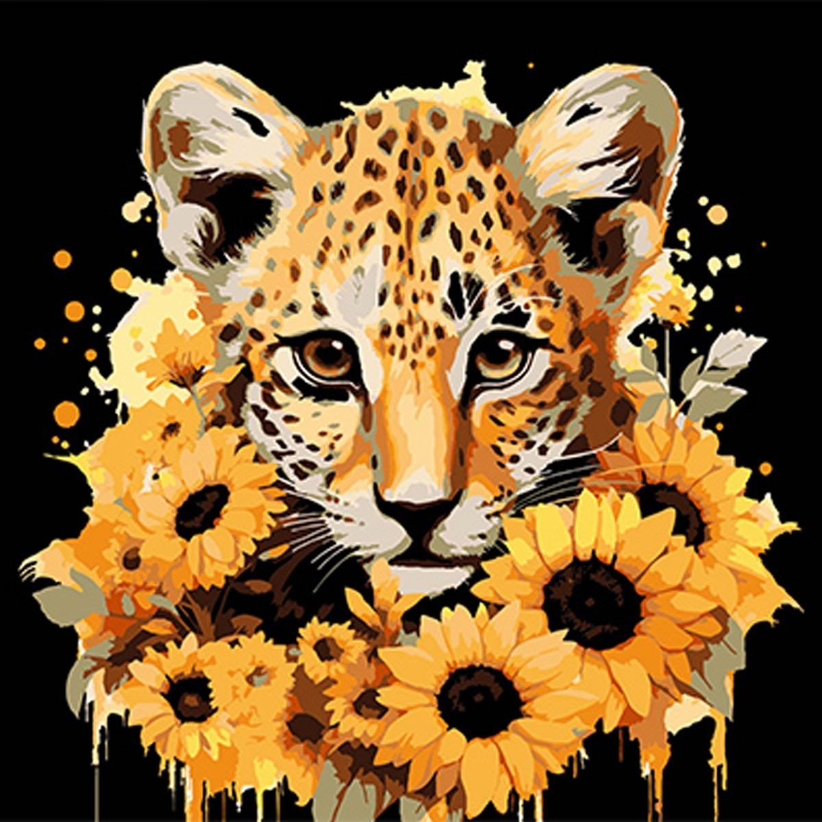 Опис Картина за номерами на чорному фоні "Леопард та золоті соняшники" 30х30 см