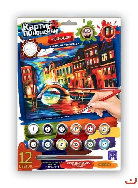 Картина за номерами (297х210 мм). У наборі: 12 акрилових фарб (основні кольори + відтінки), пензлик, контурна заготовка 2 шт., Інструкція.