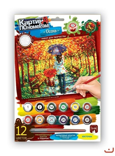 Картина за номерами (297х210 мм). У наборі: 12 акрилових фарб (основні кольори + відтінки), пензлик, контурна заготовка 2 шт., Інструкція.