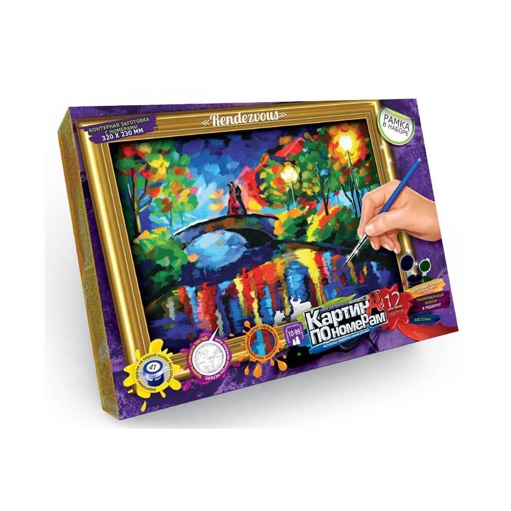 Бренд: Dankotoys Упаковка: Коробка Колір: Різнобарв'я Вага з упаковкою: 350 г Габарити в упаковці: 34 x 4 x 25 см Габарити без упаковки: 34 x 4 x 25 см Країна виробник: Україна Матеріал: Комбінований Комплектація: Рамка, 12 акрилових фарб, пензлик, контурна заготовка 2 шт., Інструкція
