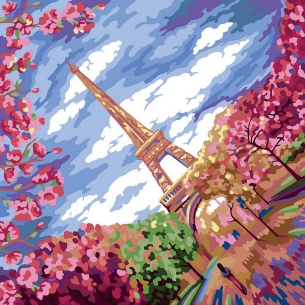 Картина за номерами "ВеснавПарижі". Для того, щоб намалювати картину, необхідно малювати по пронумерованим контурам, які відповідають кольору фарби. У наборі: натуральне полотно на підрамнику з галерейного натяжкою, паперова дублікат з контурним малюнком картини (на картині нанесена схема контурів зображення з нумерацією), 2 нейлонові художні кисті, палітра акрилових фарб в контейнерах. Всі необхідні фарби вже в комплекті і не вимагають змішування. Розмір: 40 х 40 см.