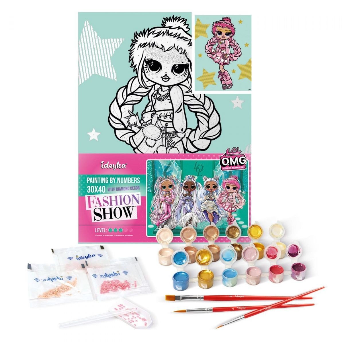 Картини серії L.O.L. Surprise! O.M.G. Fashion Show вражають деталізацією: кожен штрих передає витонченість подіумних луків. Додатковим акцентом є алмазна мозаїка, що надає зображенню об’єму та робить його ще більш яскравим і виразним. Набір для творчості з красивим сюжетом на полотні і всім необхідним для створення готової картини містить: натуральне полотно на підрамнику із галерейною натяжкою, 3 нейлонові художні пензлики; соковита палітра пронумерованих, акрилових фарб в контейнерах (металізовані та звичайні); акрилові стрази згідно комплектації набору (круглі голограмні АВ-стрази); акриловий лак для роботи зі стразами (на одній палітрі з фарбами); спеціальна ручка-стилус з однією насадкою для роботи зі стразами; лоток для сортування стразів; інструкція. На картині нанесена схема контурів зображення з нумерацією. Сегменти додатково пофарбовані в тон кольорів, якими необхідно зафарбовувати полотно.