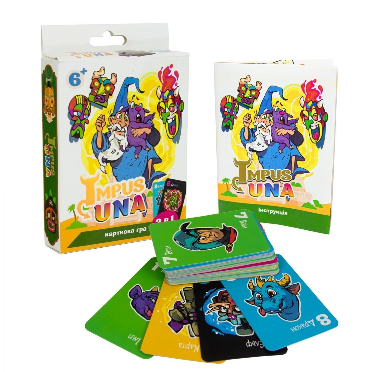 Всесвітньо популярна гра "УНО", тепер в тропічному фентезі сеттінгу, де є ельфи, орки, чарівники і пірати. Через те, що картки двосторонні, карт-бонусів стало удвічі більше. У комплекті: 110 двосторонніх карток. Для 2-10 учасників від 6 років.