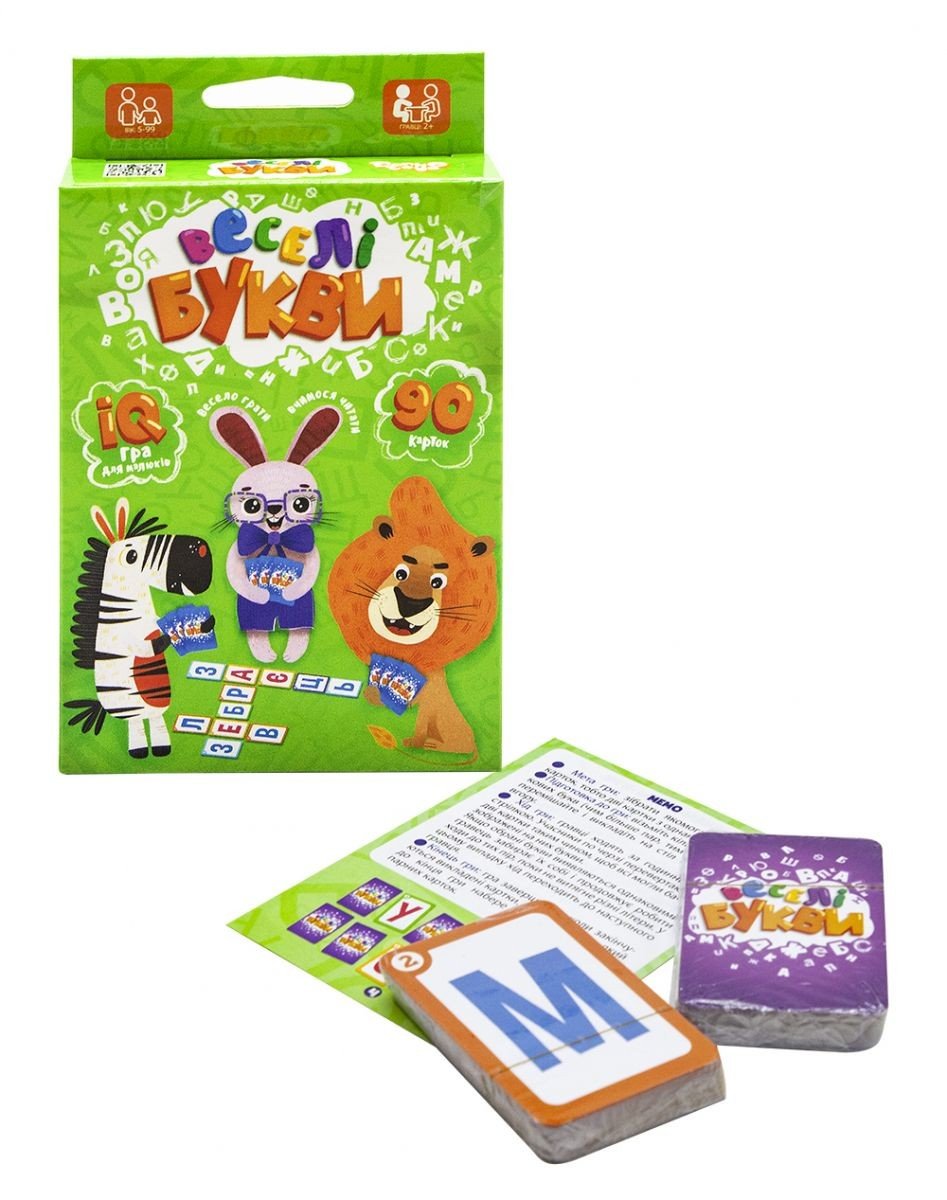 Карткова гра "Веселі літери" призначена для 2+ гравців, віком від 5-ти років. Вона допоможе навчитися читати легко і весело. В ігровій формі дитина вивчить букви, які позначають голосні і приголосні звуки, навчиться складати слова і читати. Завдяки компактному розміру гру можна брати з собою в дорогу. З нею ви не будете сумувати і проведете час з користю. Гра буде цікава не тільки дітям, а й дорослим - грайте всією сім'єю. У комплекті: 90 карток і інструкція.