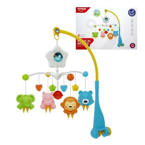 Інтерактивна музична карусель. Красива та яскрава підвіска-карусель для дитячого ліжечка. Має основу у вигляді зірочки, на якій висять 4 милі пластикові іграшки та брязкальце. У комплекті є кріплення, яке приєднується до ліжечка. Мобіль – інтерактивний, має кілька режимів: відтворює кілька заспокійливих мелодій, обертає іграшки по колу, регулює гучність, зупинка/пуск мелодій. Також є режим нічника з проєктором (одна картинка). Кожен режим можна вмикати/вимикати окремо або комбінувати. Підходить для найменших.