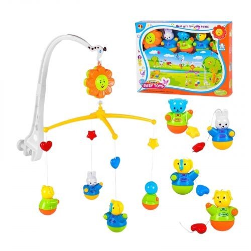 Красива і яскрава підвіска-карусель для дитячого ліжечка. Має основу-квітка, на якій висять кумедні брязкальця-звірятка і кріплення, яке приєднується до ліжечка. Також має запускной механізм, завдяки якому каруселька починає крутитися і звучить приємна заспокійлива мелодія.