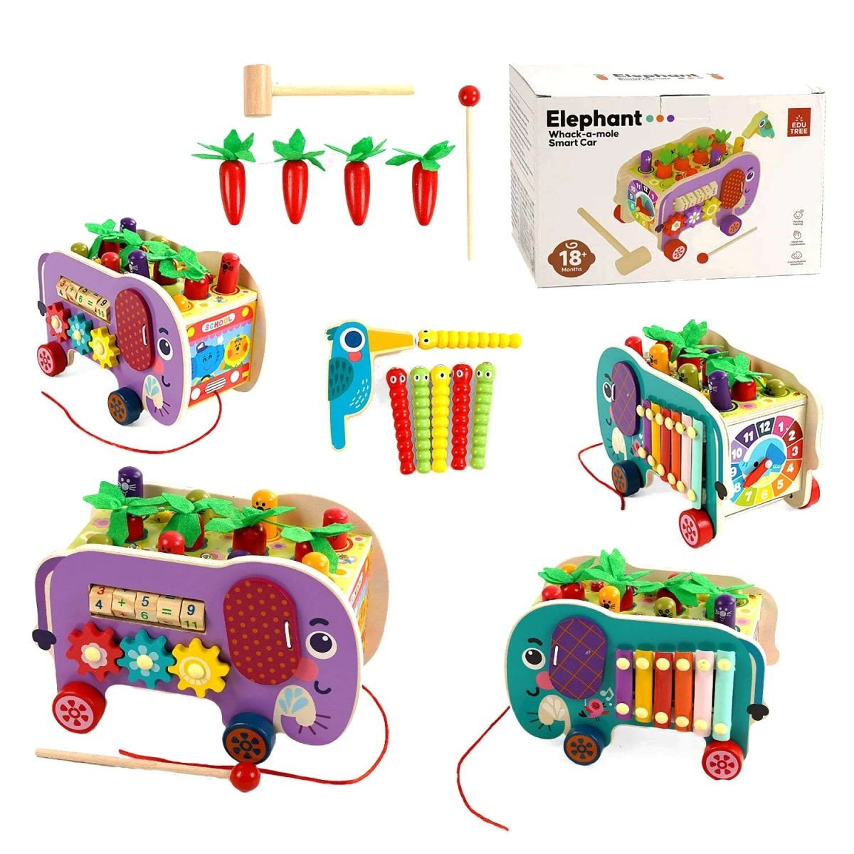 Ця багатофункціональна каталка - чудова розвиваюча іграшка для вашої дитини. Її боки наповнені різними заняттями - ксилофоном, яким можна грати, шестернями, які можна крутити, кротами, яких можна бити, морквою, яку можна витягувати, і червʼяками, яких можна ловити. Можливості практично безмежні! Крім того, за допомогою мотузки, прикріпленої до передньої частини, іграшкову машинку можна легко брати з собою куди завгодно.