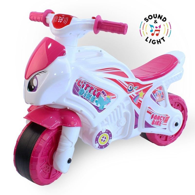 Каталка-мотоцикл зі світловими і звуковими ефекти. На кермі каталки розташовані дві кнопки. При натисканні на одну з кнопок, дитина, почує різні варіанти звучання. Разом з цим, на колесах є світлові ефекти. Зроблена з якісного пластику.