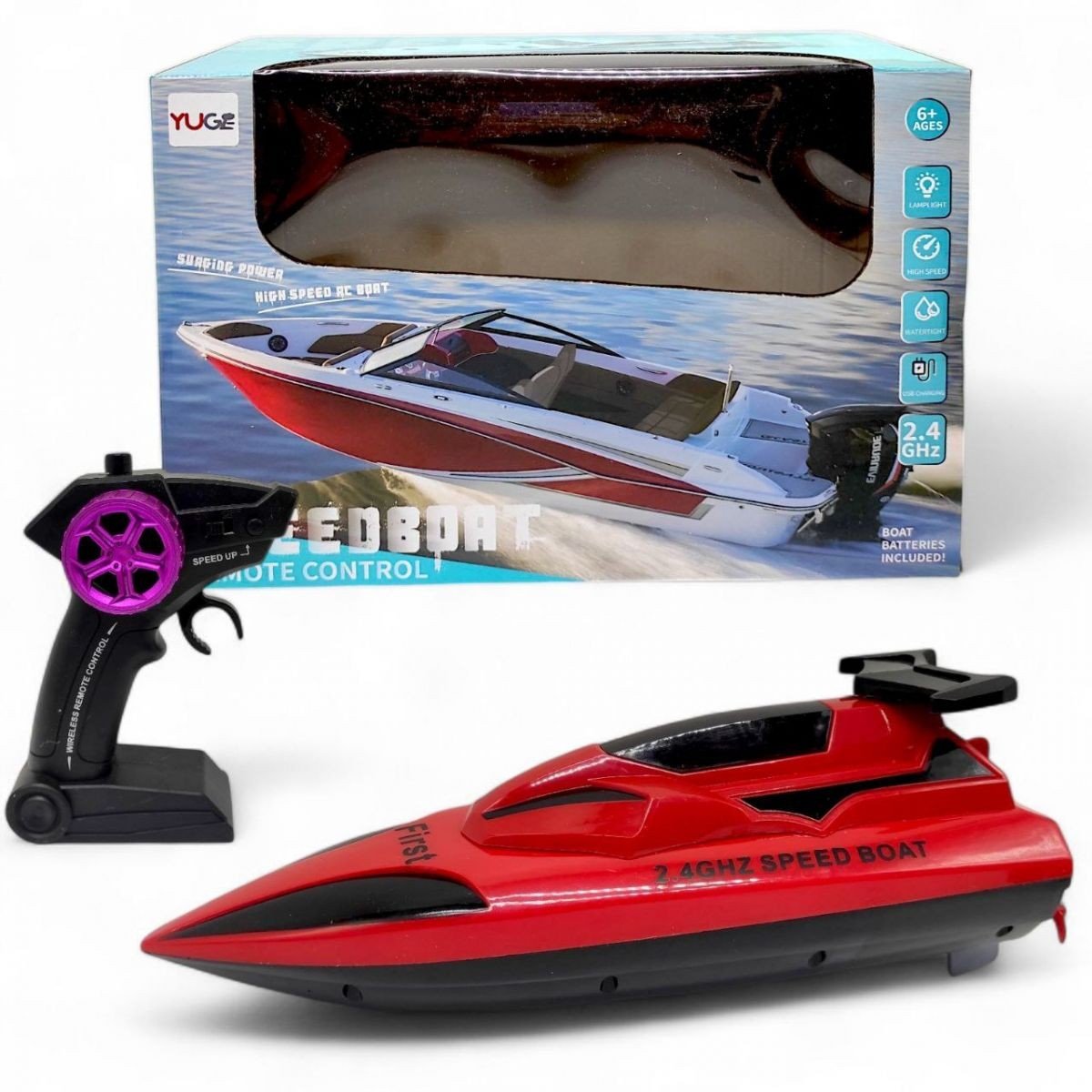 Бренд: YUGE Упаковка: Коробка Колір: Червоний Тип ел-тів живлення: Батарейки,АА Кількість ел-тів живлення: 2 Ел-ти живлення в комплекті: Ні Вага з упаковкою: 515 г Габарити в упаковці: 33.5 x 13 x 22.5 см Габарити без упаковки: 28 x 8.5 x 11 см Країна виробник: Китай Матеріал: Комбінований Комплектація: Катер, пульт дистанційного керування, акумулятор 3.7 V, USB.