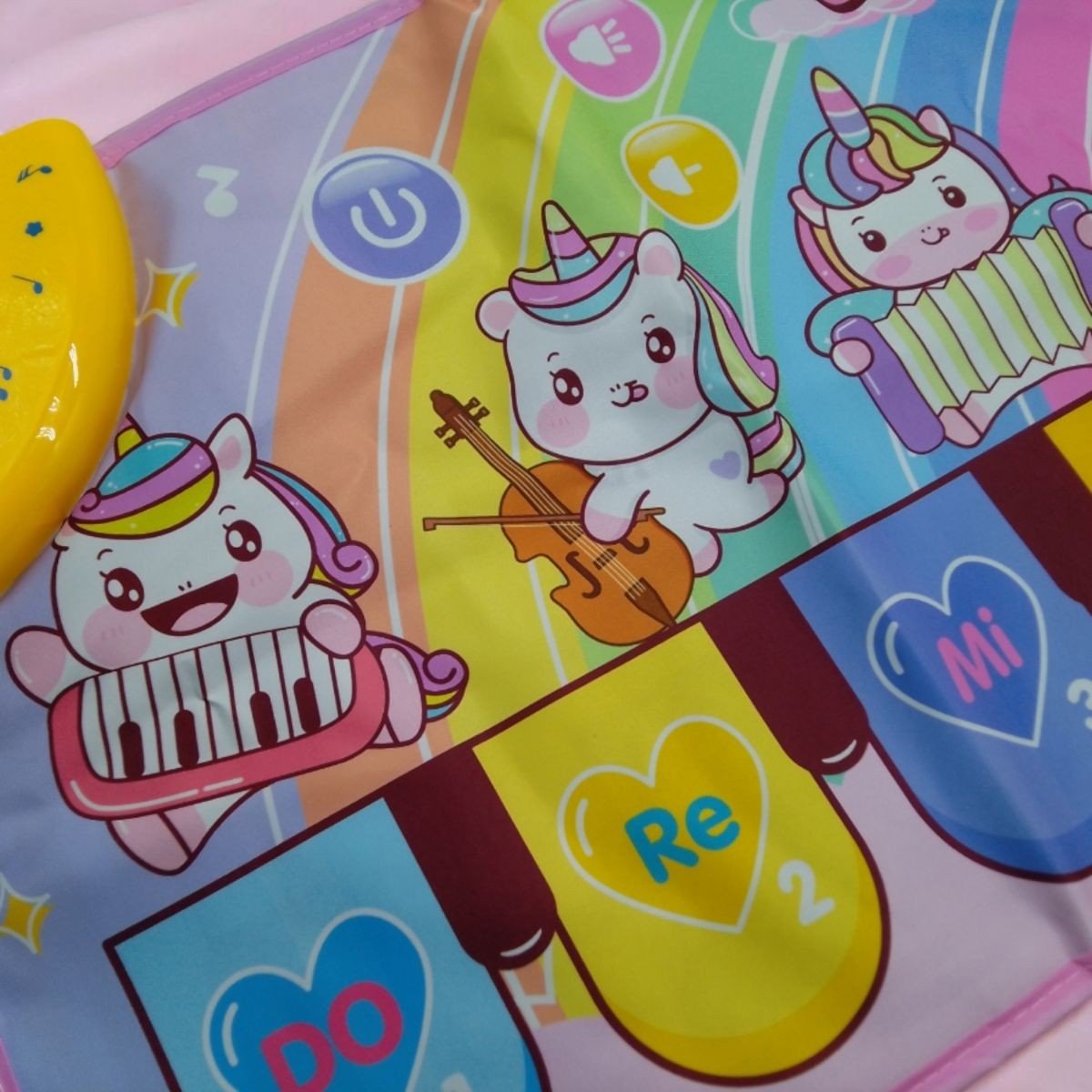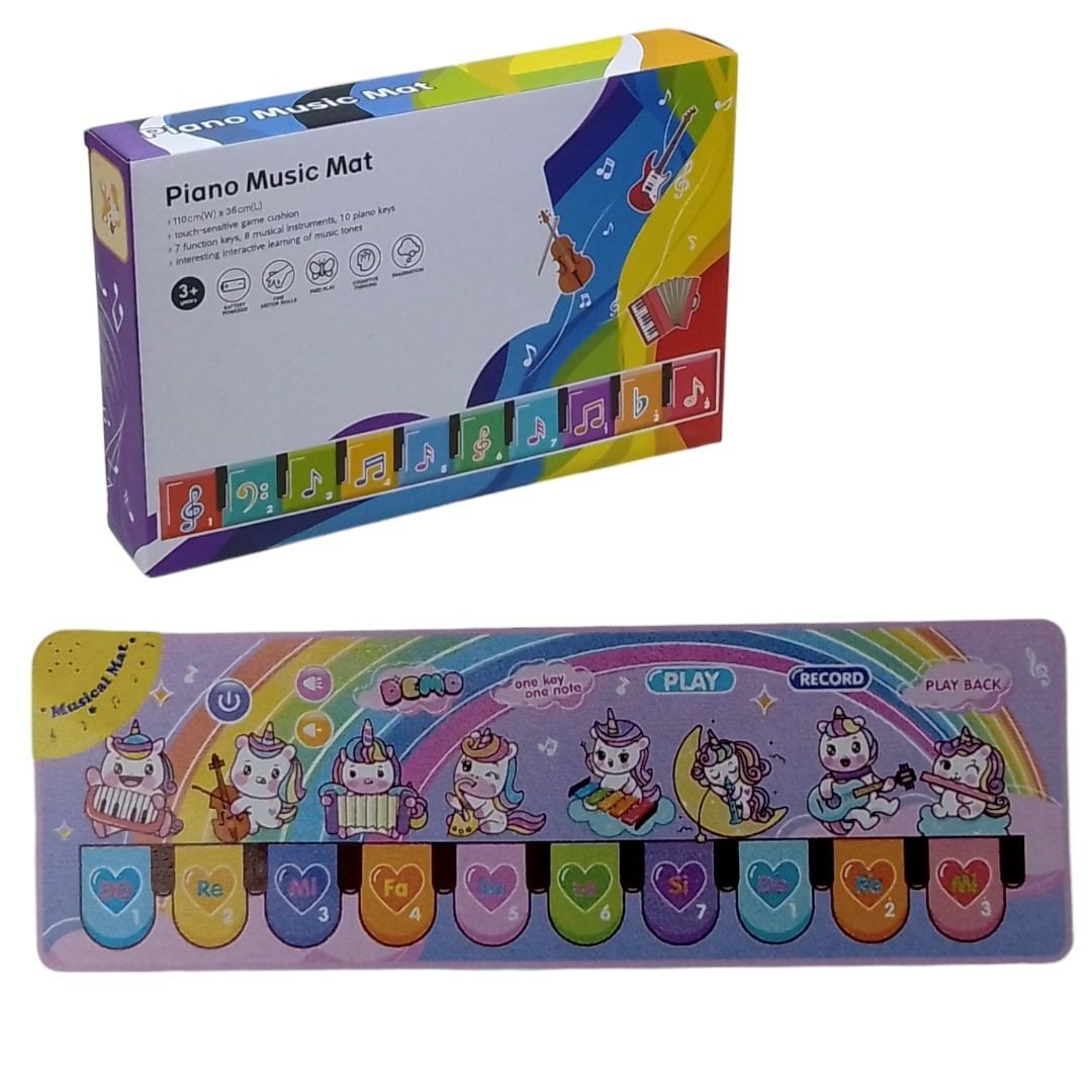 Килимок оснащений 10 клавішами та підтримує 7 музичних інструментів, серед яких фортепіано, гітара, скрипка, саксофон та інші. Дитина може вибирати інструмент та створювати свої мелодії. Є функція запису та відтворення, а також вбудовані дитячі композиції, які роблять гру ще цікавішою.
