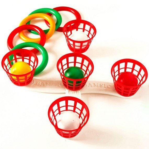 Кільцекид. Мета гри: потрапити кульками в кошик, кільцями на стовпчики і набрати більше балів ніж суперник. В комплекті: основа, 5 кульок, 5 стовпчиків, 5 кошиків і 5 кілець.