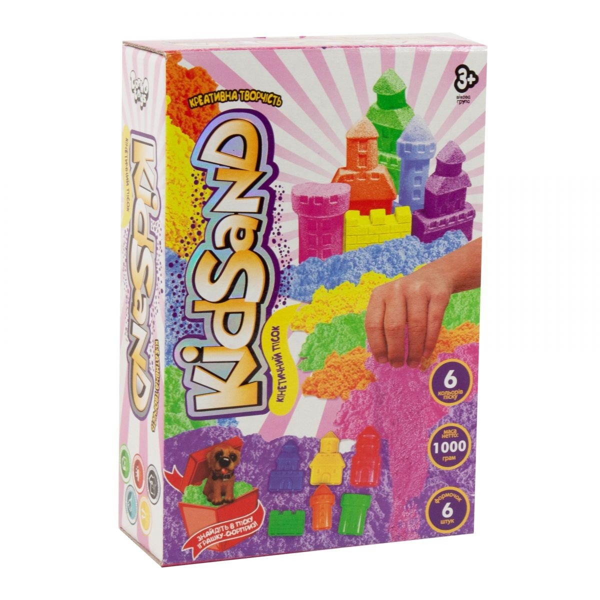 Кінетичний пісок "KidSand" з формочками 1000 р 6 кольорів. Такий пісок прекрасно тримає будь-яку форму, швидко розпадається при необхідності, а його будова відрізняється одночасно пористістю і міцністю. За відчуттями такий пісок нагадує сирий морський пісок, тільки він без води, не прилипає до рук, не забруднює одяг. У комплекті з піском йдуть 6 формочок і фігурка собачок.