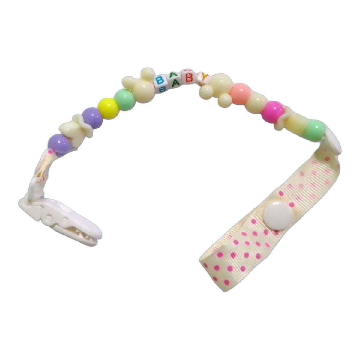 Кліпса зі шнурочком для пустушки це корисний аксесуар. Його зручність полягає в тому, що соска вашого малюка завжди буде поруч, адже кліпса кріпиться до його одягу і не приносить дискомфорту. Прикрашена милими намистинами-фігурками, виконана в дуже милому дизайні, що привертає увагу. Довжина – 27 см.