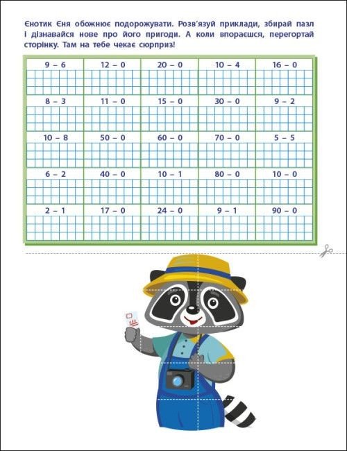 Арт-вирізалка - спеціально для тих, хто творчо підходить до навчання! Вправляйся в розвязанні прикладів та збирай яскраві математичні пазли! Також дитині належить написати свою власну історію - на кожній сторінці є підсказки про те, як розпочати наступну главу.