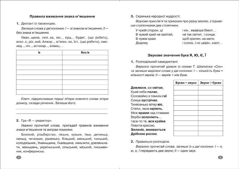 У книзі запропоновані цікаві, нестандартні завдання: диктанти з таємницею, дослідження-відновлення, творчі конструювання, правописні ігри, орфоепічні й орфографічні практикуми, мистецькі п'ятихвилинки, кросвордні та загадкові диктанти та ін. М'яка обкладинка. 40 сторінок. Мова: українська.
