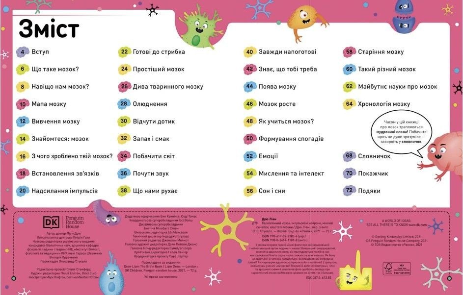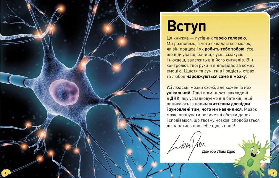 Ця книжка - путівник твоєю головою. Ми розповімо, з чого складається мозок, як він працює і як робить тебе тобою. Усе, що ти відчуваєш, бачиш, чуєш, смакуєш чи нюхаєш, залежить від його сигналів. Він контролює твої рухи й відповідає за кожну емоцію. Щастя та сум, гнів і радість, страх та любов народжуються саме в мозку. Нумо розбиратися, як цей надпотужний орган думає, вчиться й працює без упину, навіть коли ти про це не знаєш.