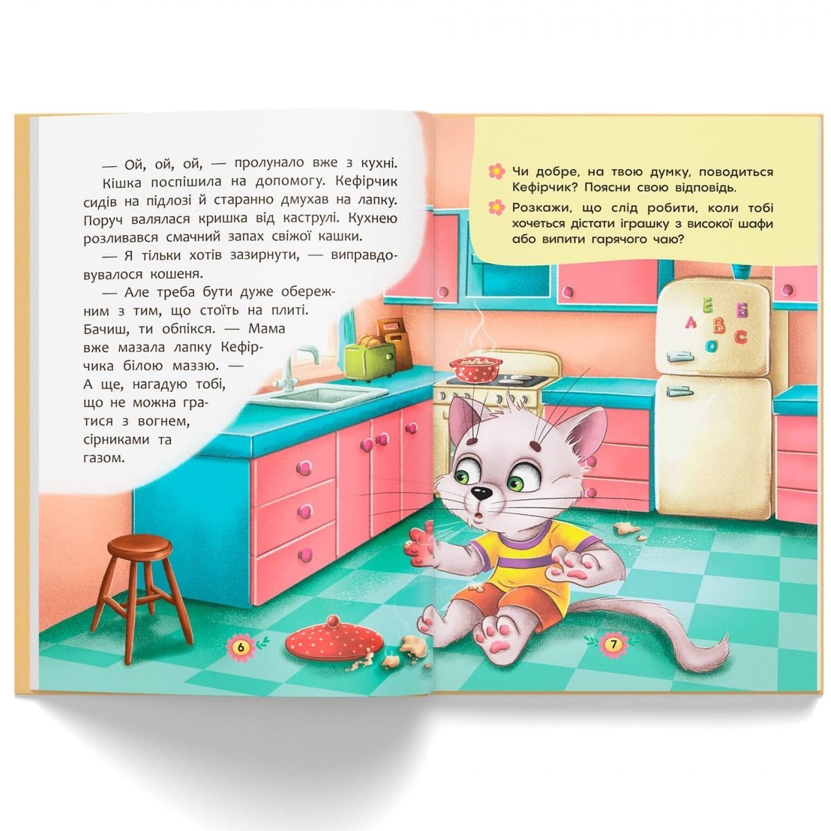 Ця книжка розповість повчальні історії про правила безпеки вдома та про те, що буває, якщо їх не дотримуватися. Ти познайомишся з грайливим кошеням Кефірчиком, яке через необачність ледь не влаштувало потоп. Прочитаєш про лисеня Сонечко, яке завдяки новому другові дізналося про правила безпеки з електроприладами. Навчишся від братів-їжачків Роба та Боба, як поводитися з гострими предметами. Наші герої вчасно зрозуміли для чого потрібні правила та яка важлива безпека.