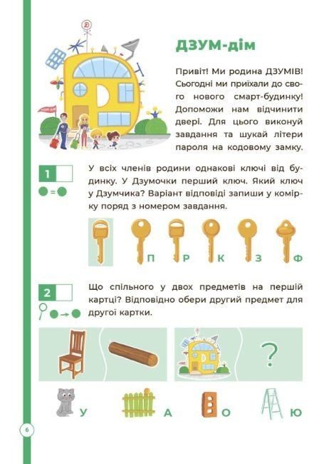 Дитина з розвиненим логічним мисленням вирізняється з-поміж інших. Вона легко вчиться, знаходить різні шляхи розв’язання задач, уміє обґрунтовувати свою думку. Та й взагалі, усе, що відбувається довкола неї,— цікаве й зрозуміле! Нумо розвивати логічне мислення дитини разом із родиною ДЗУМІВ, які живуть у сучасному світі поруч із такими незвичними родичами як: Комп-дідусь, Бабуся Флешка, Дядько Коптер, Тітка Камера та іншими друзями-гаджетами.Маленьким Дзумчику та Дзумочці відповідно 6 та 5 років, і вони готуються до школи. Щоб полегшити їхнє майбутнє навчання, необхідно разом з ними потренуватися у розв’язанні логічних завдань! Що будемо робити? Зіставляти предмети за кольором, розміром, матеріалом., сортувати предмети за призначенням та характеристиками, проходити лабіринти, шукати закономірності, розшифровувати закодовану інформацію.