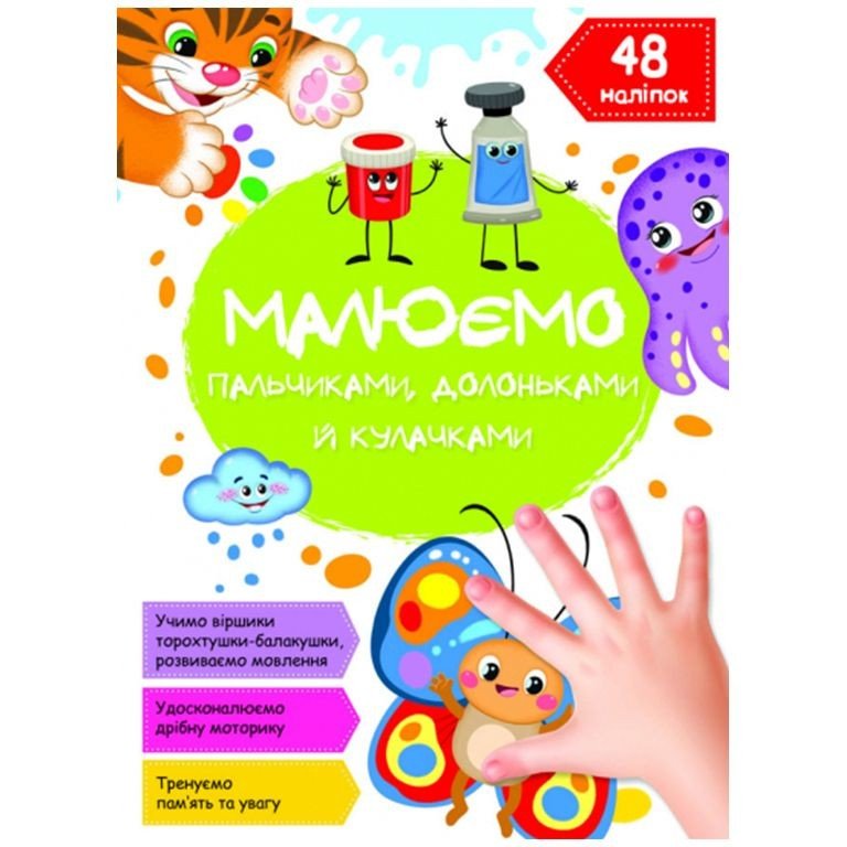 Це книжка для малюка, який ще не тримає в руках пензлика й олівця. З нею юний художник зможе створювати свої шедеври, просто вмочуючи пальчики у фарбу та торкаючись ними сторінок! Щоб йому було легше впоратися, ми зробили картинки великими й розмістили поряд зразки. Наклеюйте наліпки, виконуйте разом із дитиною завдання та розучуйте віршики, щоб розвинути дрібну моторику, пам'ять і мовлення дошкільняти.