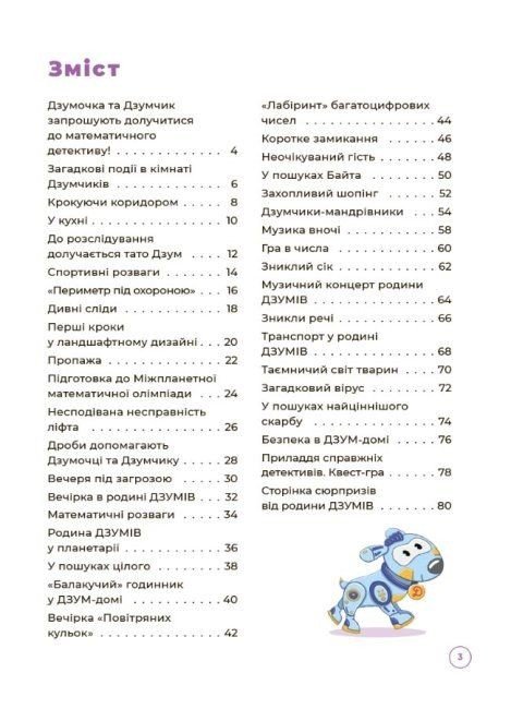 Нумо вивчати математику разом із родиною ДЗУМів, які живуть у сучасному світі поруч із такими незвичними родичами як: Комп-дідусь, Бабуся Флешка, Дядько Коптер, Тітка Камера та іншими друзями-гаджетами. Перед ними постає непроста задача — допомогти маленьким Дзумчику та Дзумочці підготуватися до школи та опанувати 33 перші навички математики.Що будемо вивчати? Цифри й числа від 0 до 10, орієнтування в просторі (попереду – позаду, близько – далеко, ліворуч – праворуч, тощо), геометричні фігури та форми, величину предметів (товстий – тонкий, велике – маленьке, високий – низький тощо), пори року й дні тижня, та ще багато цікавого!