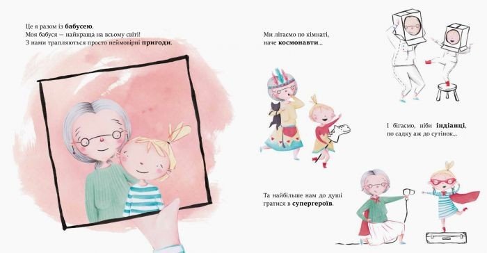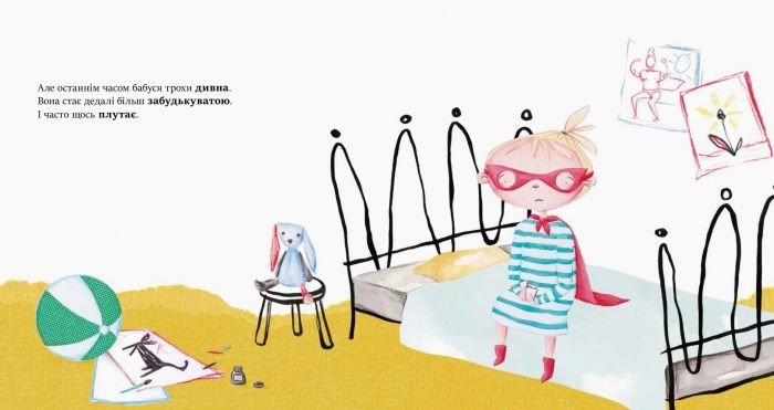 Ярка книжечка з барвистими ілюстраціями. Цікава історія про дівчинку і її бабусі з хворобою Альцгеймера. Внучка допомагає бабусі знайти її пам'ять, доглядає за нею і допомагає з роботою по будинку. Тверда обкладинка. 24 сторінки. Мова: український.
