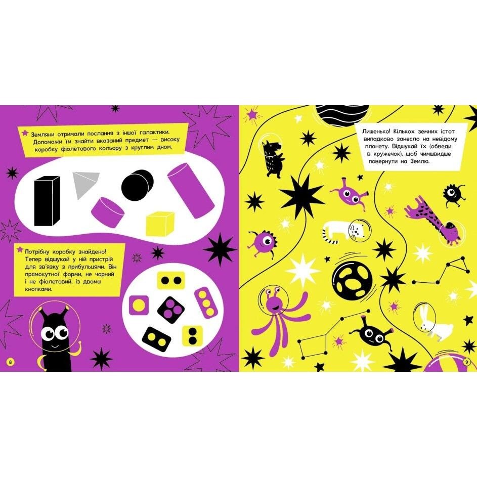 Книжка-активіті «Космос» наповнена іграми та завданнями, щоб навчити дитину критично мислити, встановлювати послідовність, читати й обчислювати, задіювати логіку, увагу та уяву. Головоломки з інопланетянами, математичні приклади з ракетами, лабіринти з планетами й космонавтами — усе це (і багато іншого) на суперяскравих флуоресцентних сторінках, які так до вподоби молодшим школярам. Якщо розвиватися — то яскраво!