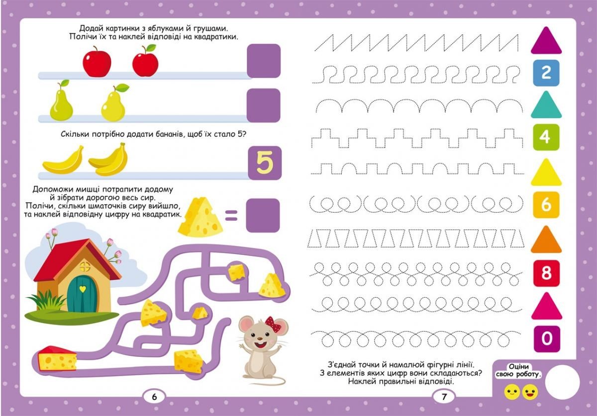 Яскраві прописи-тренажер спрямовані на вивчення математики. Усередині багато яскравих ілюстрацій та цікавих завдань, які малюкові потрібно доповнити. Допоможуть вивчити цифри та навчать рахувати. Також у комплекті є наклейки. Відмінно підійде для найменших.