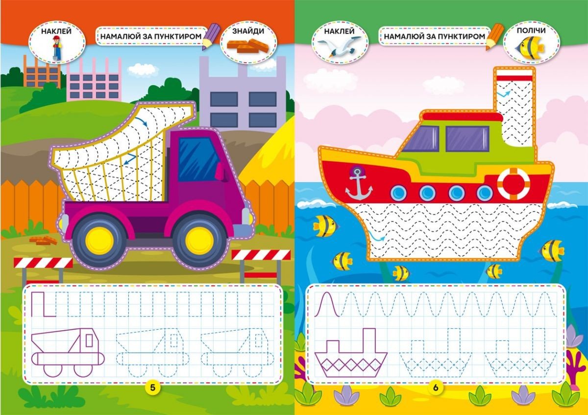 У цій книжці стільки цікавого й корисного! Проводячи лінії по пунктиру, готуйте руку дитини до письма. Вирізаючи та наклеюючи, розвивайте дрібну моторику. Відшукуючи сховані предмети, тренуйте спостережливість та пам'ять. Рахуючи картинки, опановуйте лічбу. Виконуючи завдання та граючись, виховуйте креативного малюка. На сторінках книжки ви знайдете 40 наліпок, розвивальні розписи, 4 іграшки та ігровий лабіринт.