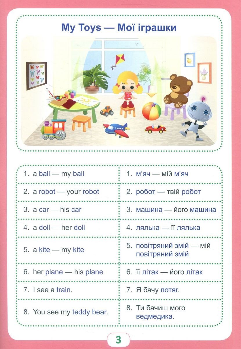 У цьому посібнику пропонується ефективний і простий спосіб вивчення перших слів іноземної мови за допомогою перевіреного методу «Пиши-стирай-запам'ятовують». Тематичний підбір слів, словосполучень, пропозицій і граматичних конструкцій побудований за принципом від простого до складного. Користуючись чарівними закладками в книжці, щоб закривати слова або малюнки, можна практикуватися в вимові і написанні слів. Книга надає 11 поширених тим, завдання для закріплення матеріалу і словник. У кожній темі ви знайдете: • 9 основних слів з малюнками-підказками • вимова англійських слів (транскрипція, транслітерація) • прості словосполучення • яскраві веселі малюнки 24 сторінки. М'яка обкладинка.