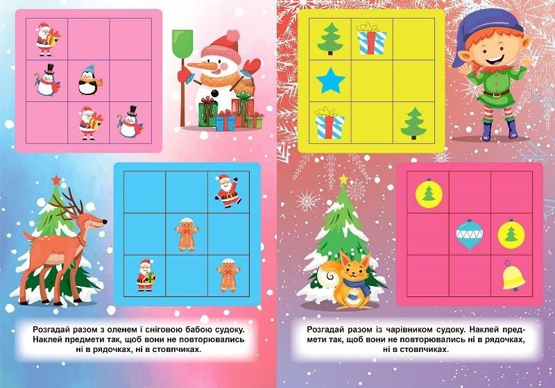 У чарівну зимову пору всі дорослі хочуть створити для дітей неймовірну новорічну атмосферу. Книжки серії "Зимові ігри та завдання" стануть у цьому найкращими помічниками. А книга завдань з наліпками "Зимові судоку" дасть можливість батькам весело та с користю провести час із малечею. Виконання запропонованих завдань розвиватиме в дитині посидючість, уважність, творче мислення, дрібну моторику, а додаткові мотиваційні наліпки піднімуть настрій.