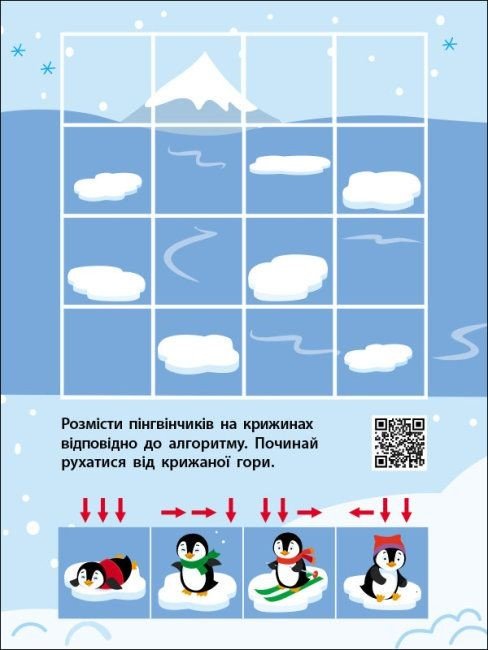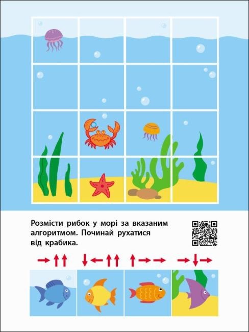 Цікава книжечка, яка поєднала у собі будівництво доріжок за алгоритмами або розшифровуватиме логічну вправу. На кожній сторінці новий сюжет. Містить різні види активностей: вирізування, наклеювання, малювання. Призначений для дітей від 5-ти років.