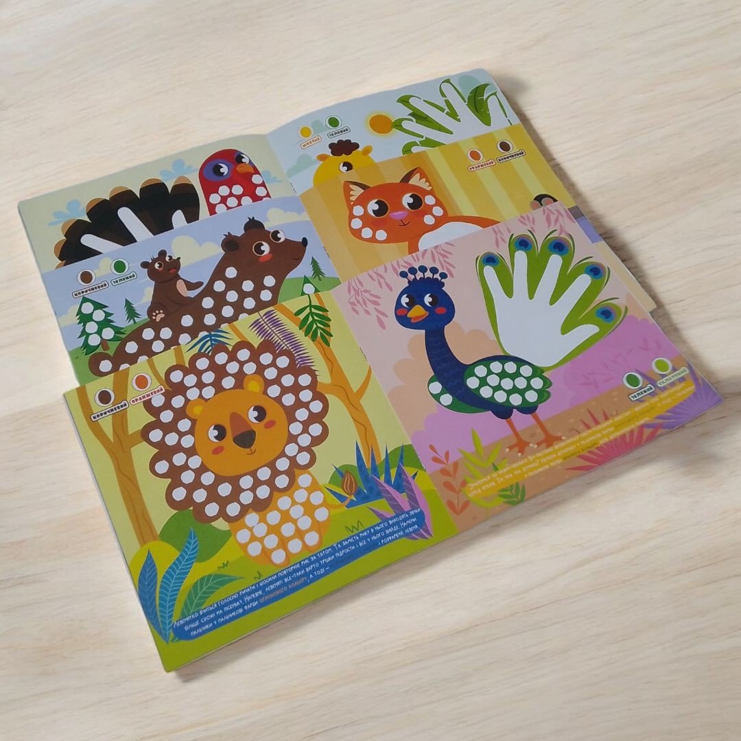 Малювання пальчиками й долоньками має великий розвивальний ефект. Завдяки цій найпершій техніці малювання розвивається дрібна моторика та координація рухів, тактильні відчуття, творче мислення, памʼять, відбувається знайомство з кольорами, дитині з раннього віку прививається любов до малювання. На кожному малюнку в книжечці є спеціальні місця, які потрібно розфарбувати пальчиками, долоньками ао ж тим і тим. Рекомендовано для діток 1-4 років. 12 сторінок у мʼякій палітурці.