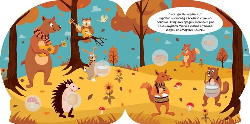 Представляємо до Вашої уваги чарівну книжечку з наліпками у вигляді кришталевої кулі. На її сторінках ви побачите, як люди та тварини радіють осені та весело проводять час. Вони граються під дощем, збирають гриби, ягоди і святкують Геловін. Також за допомогою наліпок малюк доповнюватиме малюнки, розвиватиме дрібну моторику, кмітливість, логіку та фантазію.