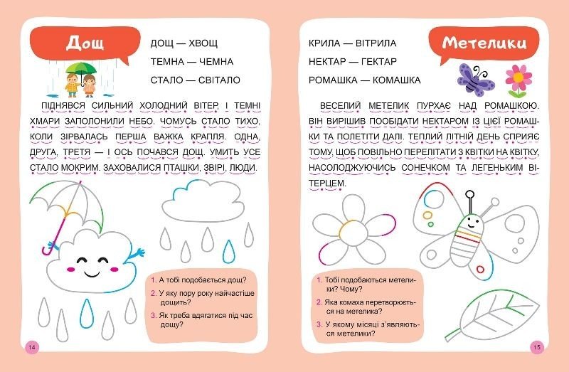 Навчання читанню та письму - цікаве та веселе заняття. Запропоновані в цій книзі завдання сформують навичку впевненого читання текстів. Для підготовки руки до письма на кожній сторінці надано контурні малюнки, які дитина зможе навести різнокольоровими олівцями чи фломастерами та розфарбувати. А для розвитку мовлення та засвоєння прочитаного запропоновано питання та завдання. Принцип "прочитали та навели" зробить навчання легким та приємним.