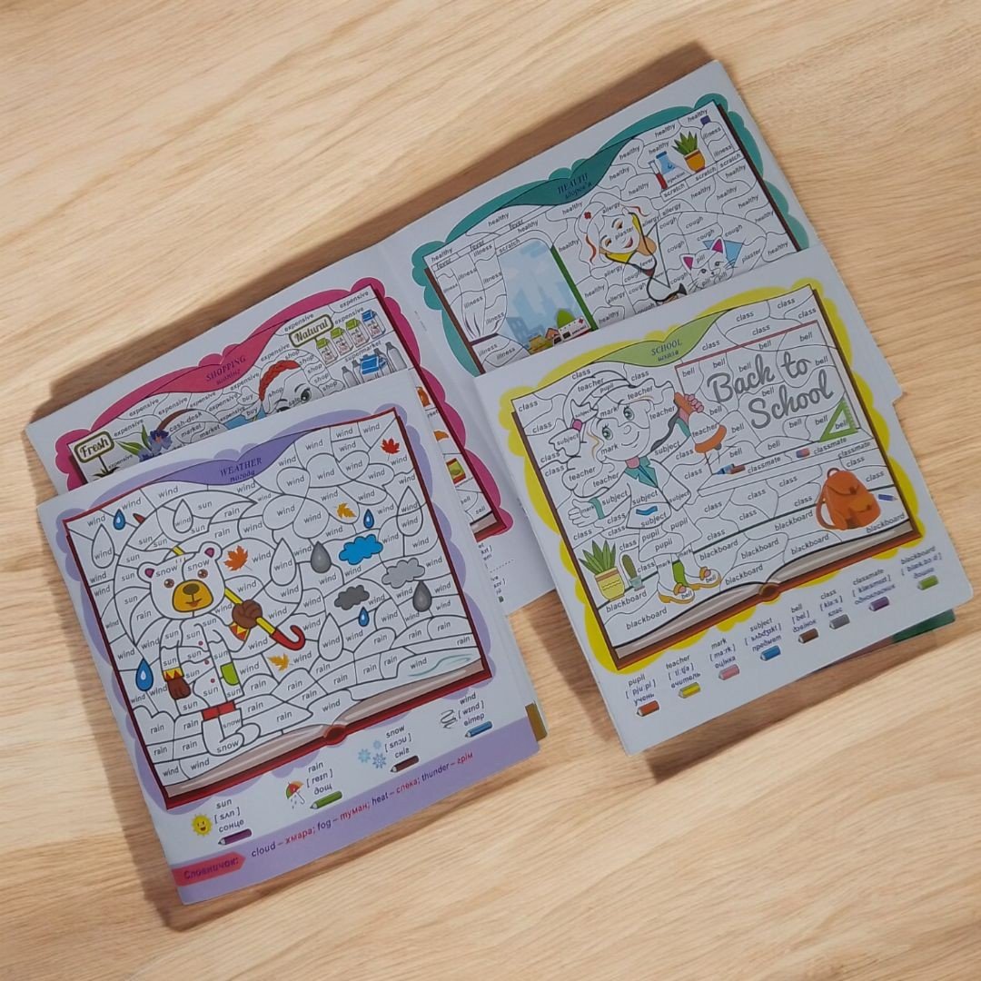 Серія розмальовок "Малюємо та вчимо англійську" створена за сучасною методикою вивчення іноземної мови, в основу якої покладено поєднання навчання, повторення, малювання та гри. Малюнки розбиті на частинки, де кожен колір відповідає певному англійському слову відповідної тематики є переклад слова та його транскрипція. Розмальовки можна використовувати як для домашніх занять, так і на заняттях з англійської мови в садочках, школах, на гуртках, тощо.