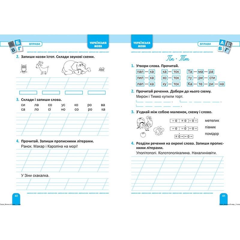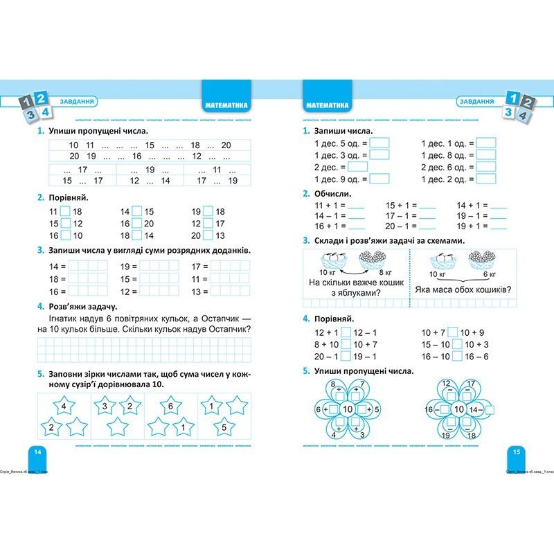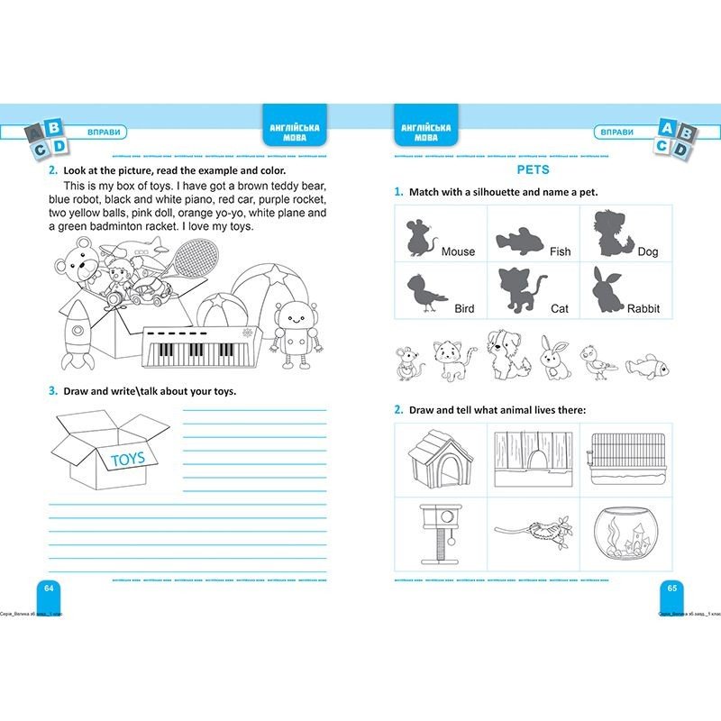 Дана книжка призначена для вдосконалення учнями початкових класів набутих під час навчання вмінь і навичок з математики, української та англійської мов. Тренажер містить велику кількість вправ з основних тем шкільного курсу 1 класу. 80 сторінок. В мʼякій обкладинці.