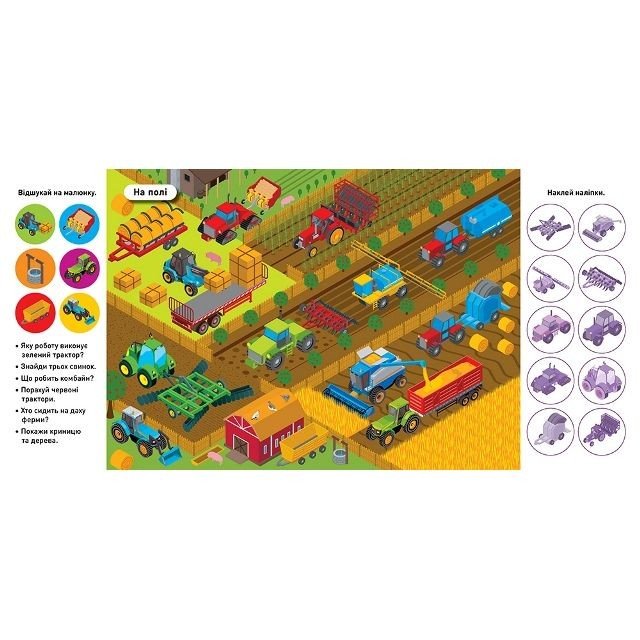 Завдання даної книжки допоможуть дитині розвинути мислення, кмітливість, увагу та дрібну моторику. Малюк відчує себе дослідником, бо шукатиме різні предмети, рослини, тварин, транспорт, наклеюватиме яскраві наліпки. Запропоновані питання допоможуть дитині попрактикувати вміння орієнтуватися в просторі (угорі - внизу; ліворуч - праворуч), повторити кольори, розміри (більший - менший, високий - низький). 10 сторінок + аркуш з наліпками. Мʼяка обкладинка.