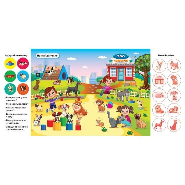 Завдання даної книжки допоможуть дитині розвинути мислення, кмітливість, увагу та дрібну моторику. Малюк відчує себе дослідником, бо шукатиме різні предмети, рослини, тварин, транспорт, наклеюватиме яскраві наліпки. Запропоновані питання допоможуть дитині попрактикувати вміння орієнтуватися в просторі (угорі - внизу; ліворуч - праворуч), повторити кольори, розміри (більший - менший, високий - низький). 10 сторінок + аркуш з наліпками. Мʼяка обкладинка.