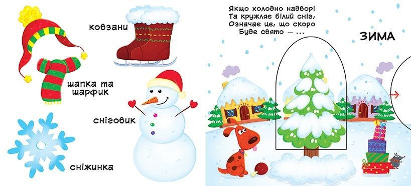 Книжка з механізмом. Пори року. Рухай і крути механізми, знайомся з порами року, відгадай загадки, читай вірші. Виготовлена з картону.