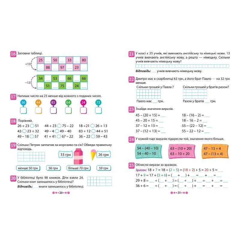 Запропонований зошит-практикум містить велику кількість вправ і задач, а також, математичну гру. Посібник призначений для удосконалення обчислювальних навичок дитини, умінь розрізняти геометричні фігури за істотними ознаками, креслити, оперувати величинами й розвʼязувати різні види задач. Дібрані завдання цікаві та спрямовані на розвиток математичних здібностей і пізнавального інтересу учнів. Видання впорядковано відповідно до топових освітніх програм початкової школи. 48 сторінок. Мʼяка обкладинка.