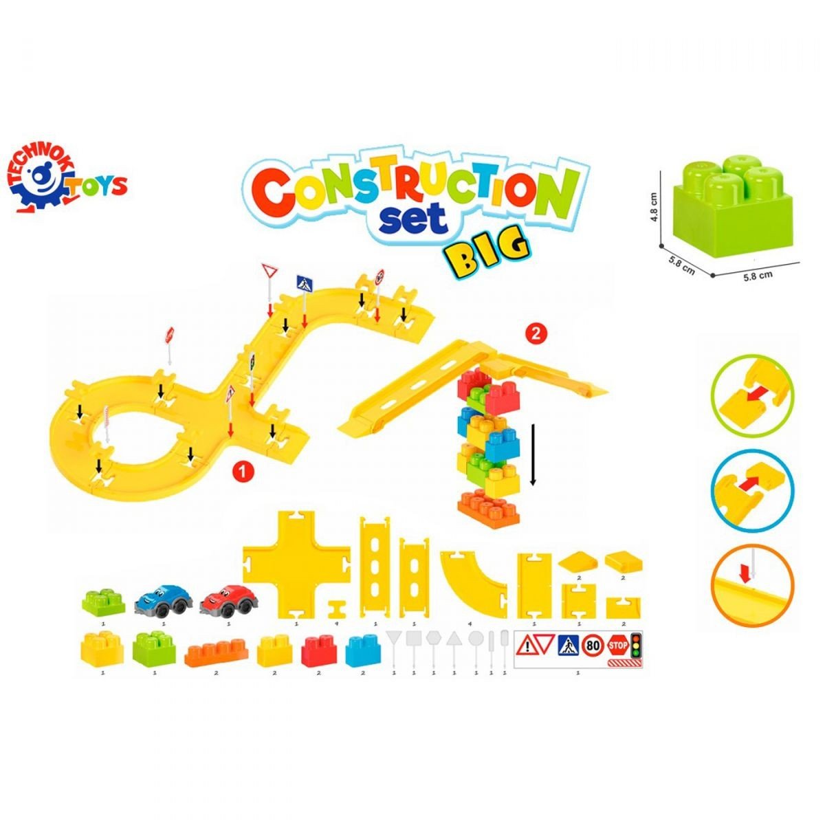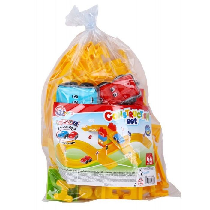 Яскравий пластиковий конструктор, що складається з 44 деталей досить великого розміру, 7 дорожніх знаків та двох машинок. Конструктор розвиває дрібну моторику рук, фантазію та уяву. У наборі є всі необхідні деталі для гри у гонки із друзями. Виготовлено все із якісного пластику.