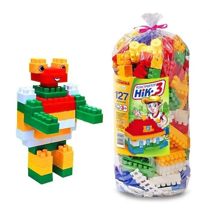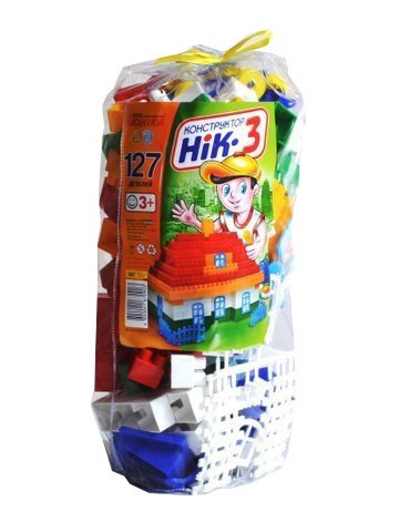 Пластиковий різнокольоровий конструктор "НИК-3" на 127 деталей. З деталей можна побудувати будиночок з окнамі.В комплект також включені наклейки і машинки.